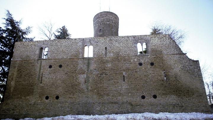 Il muro rimasto non presenta porte d’accesso, ma soltanto finestre che ne interrompono la compatta struttura: al piano superiore si aprono sul vuoto tre bifore archiacute con colonnina centrale, sovrastate da cornice in pietra: inferiormente quattro feritoie denunciano l’uso in prevalenza militare del castello.