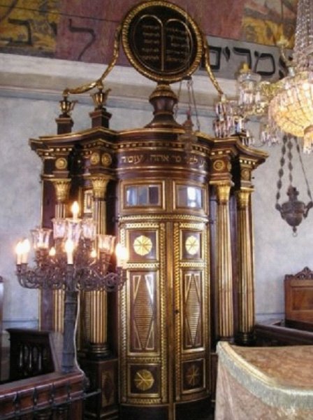 (1) – Arón (Arón ha-Kodesh) : “Armadio sacro”. È l’armadio posto sulla parete orientale della sinagoga, volta verso Gerusalemme. Vi sono custoditi i rotoli della Torà (3), rivestiti dei loro ornamenti.