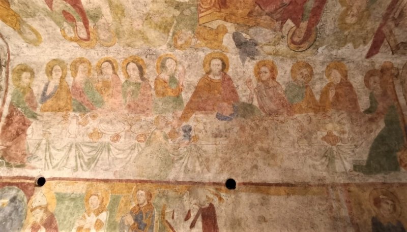 L’Ultima Cena è dipinta sulla parte destra della volta; gli Apostoli sono dietro ad un tavolo rettangolare, tranne Giuda che, come di solito nelle raffigurazioni medievali, sul davanti, mentre Gesù gli sta dando il boccone.