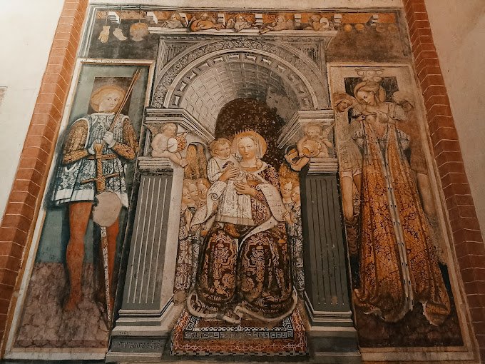 La Chiesa, del XV secolo, ha in facciata un bel rosone decorato da formelle in cotto. L’interno, composto da tre navate con volte a crociera costolonate, conserva affreschi della seconda metà del 1400.