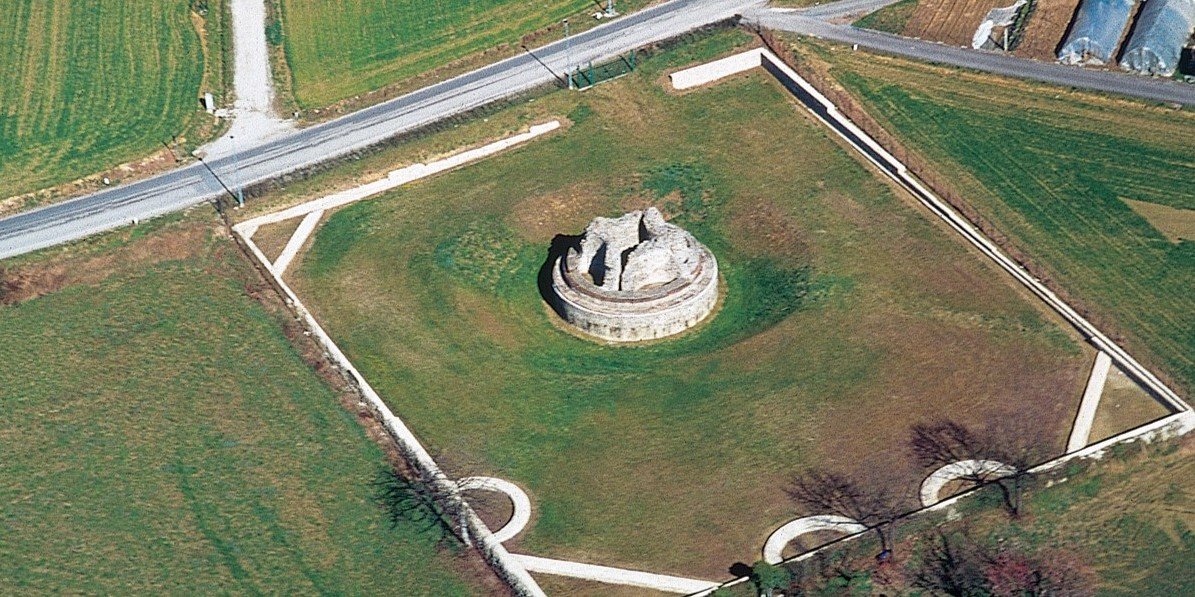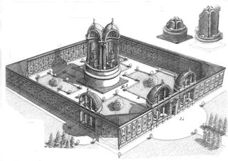 Formato da un recinto rettangolare articolato in nicchie con all’interno un monumento di grandi dimensioni composto da una piattaforma quadrata che fa da base a un alto tamburo cilindrico e quattro nicchioni originariamente coperti a volta.