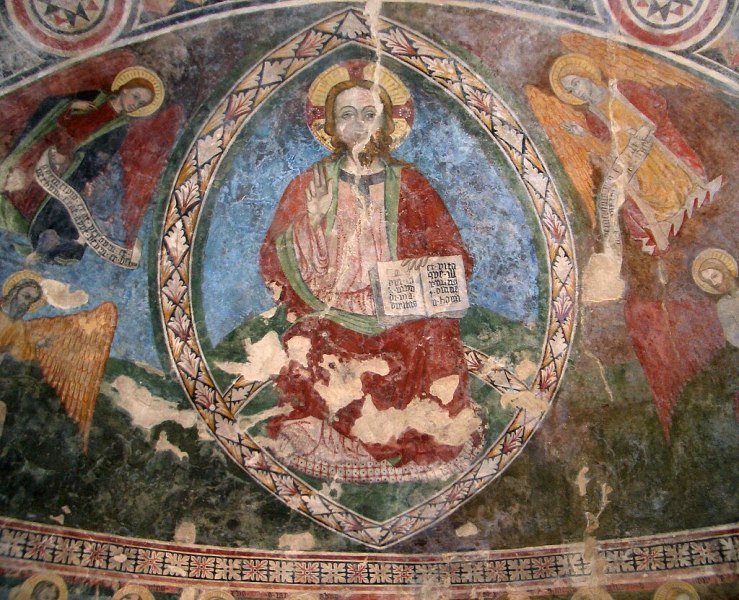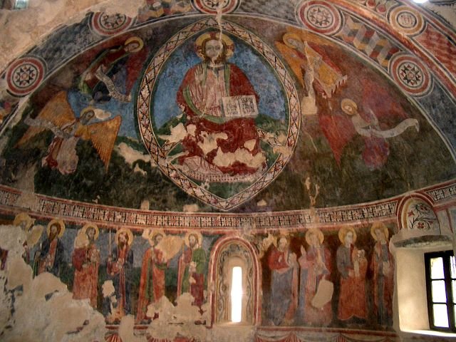 L’elemento più rilevante sono gli affreschi databili nel periodo tra la fine del ‘300 e primi anni del ‘400, attribuibili ad un pittore formatosi sulla tradizione post-giottesca. Ai due lati dell’abside, sotto i due pennacchi a tromba posti tra le pareti laterali e l’arco absidale è conservata un’Annunciazione, con l’arcangelo Gabriele alla sinistra e la Vergine alla destra. Nell’abside è stato rinvenuto un ciclo pittorico che fu coperto da tinteggiatura. Nel catino absidale è raffigurato il Cristo Pantocratore in una mandorla con i quattro Evangelisti e i dodici Apostoli nella parete sottostante.