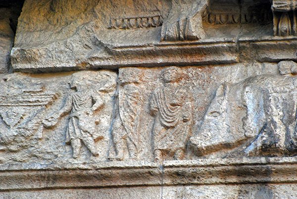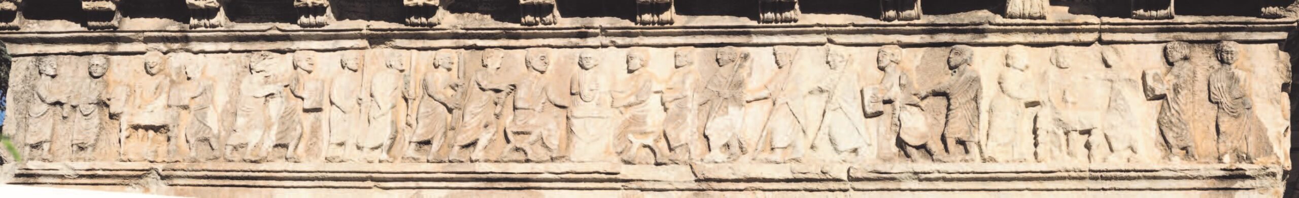 Il fregio figurato è ben leggibile nonostante alcune abrasioni e lacune, è integralmente conservato sui lati maggiori nord e sud e sul lato breve ovest, mentre sul lato orientale ne rimane solo un tratto presso l’angolo sud. I rilievi rappresentano scene relative al patto concluso con Roma. Sui lati lunghi (nord e sud) è rappresentata la stessa scena, sia pure con qualche differenza: si tratta del solenne sacrificio compiuto da Cozio alla presenza dei Romani (rito detto suovetaurilia dal nome delle vittime sacrificate: un maiale, un ariete, un toro), con il quale il patto fra i due popoli riceveva la sanzione religiosa e giuridica. Sul lato ovest la scena rappresenta proprio l’atto della stipulazione del patto. Al centro, ai lati di un’ara che serve da tavola, sono due personaggi togati (Cozio e il generale romano), che tenendo nelle mani il rotolo del patto abbracciano il rappresentante della più importante delle 14 città. Ai lati sono magistrati romani e i rappresentanti delle altre 13 città.