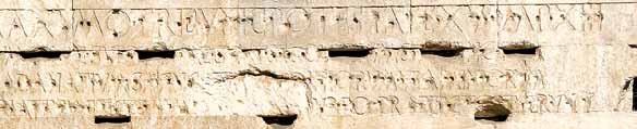 La parte superiore è costituita da un attico sul quale era l’iscrizione dedicatoria, privo dei gruppi statuari che dovevano decorarne la sommità e oggi scomparsi. I numerosi fori visibili sulla superficie del monumento sono dovuti al prelievo – avvenuto già in epoca antica – delle grappe metalliche che tenevano uniti i blocchi. Pure strappate sono le lettere in bronzo dell’iscrizione dell’attico, che quindi si presenta leggibile soltanto attraverso la posizione dei fori di fissaggio delle lettere e delle incisioni di guida per le lettere stesse.