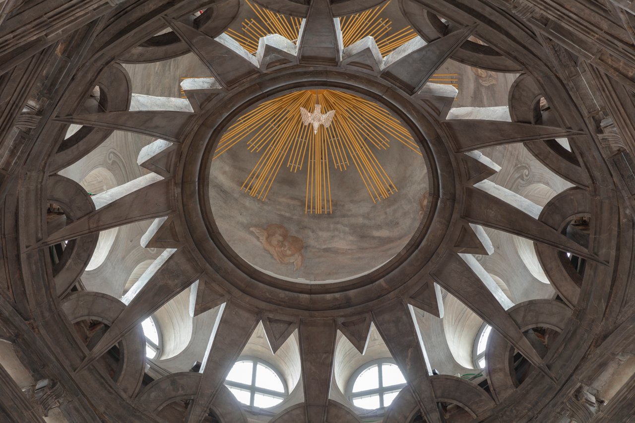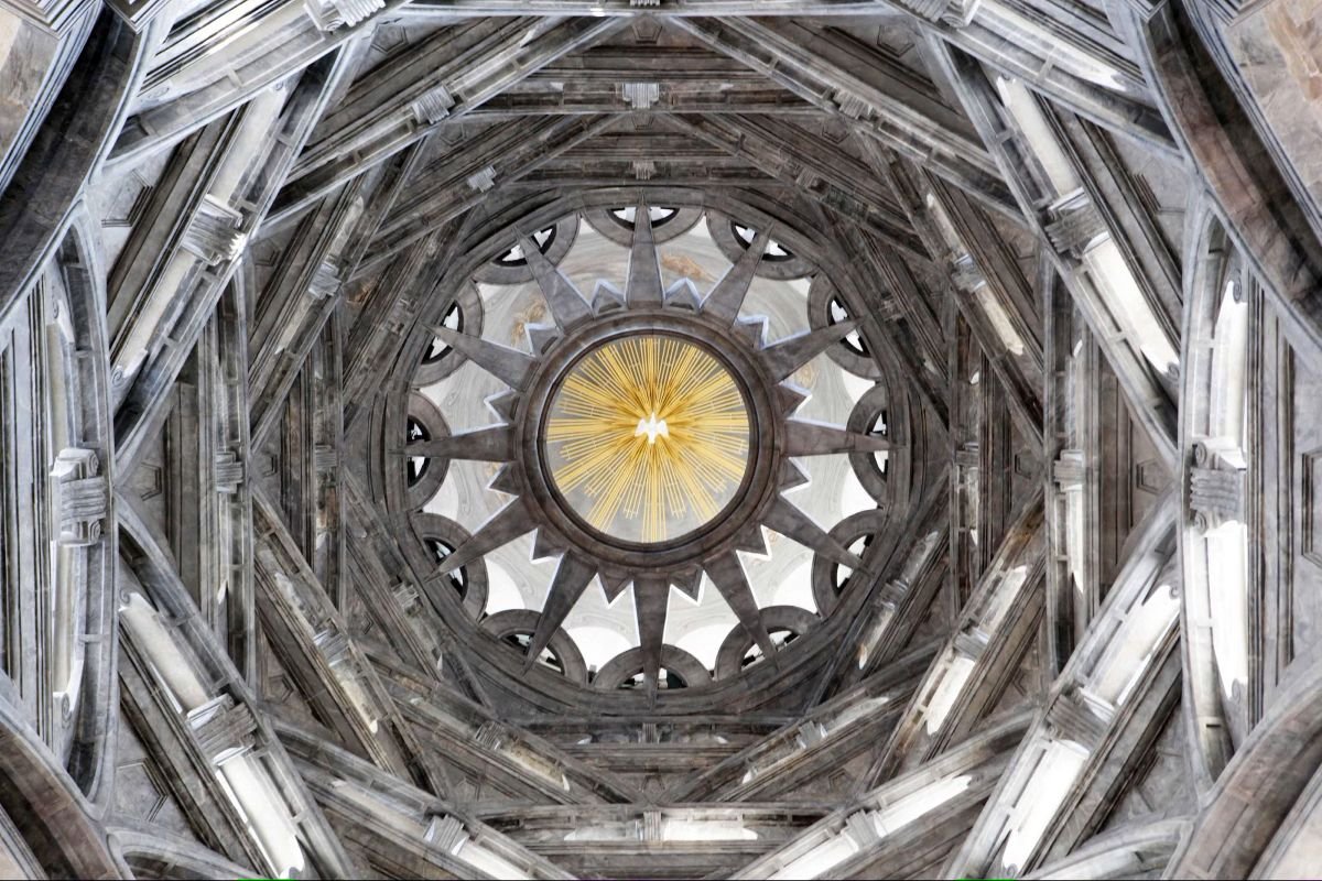 La cupola è impostata su sei livelli costituiti da sei piccoli archi sovrapposti e sfalsati disposti in pianta esagonale, per convergere poi nella stella-sole posta all’apice, dove spicca la colomba dello Spirito Santo.