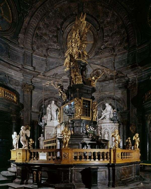 La struttura tipicamente barocca è realizzata con marmi neri, arricchiti da decorazioni e sculture in legno dorato.