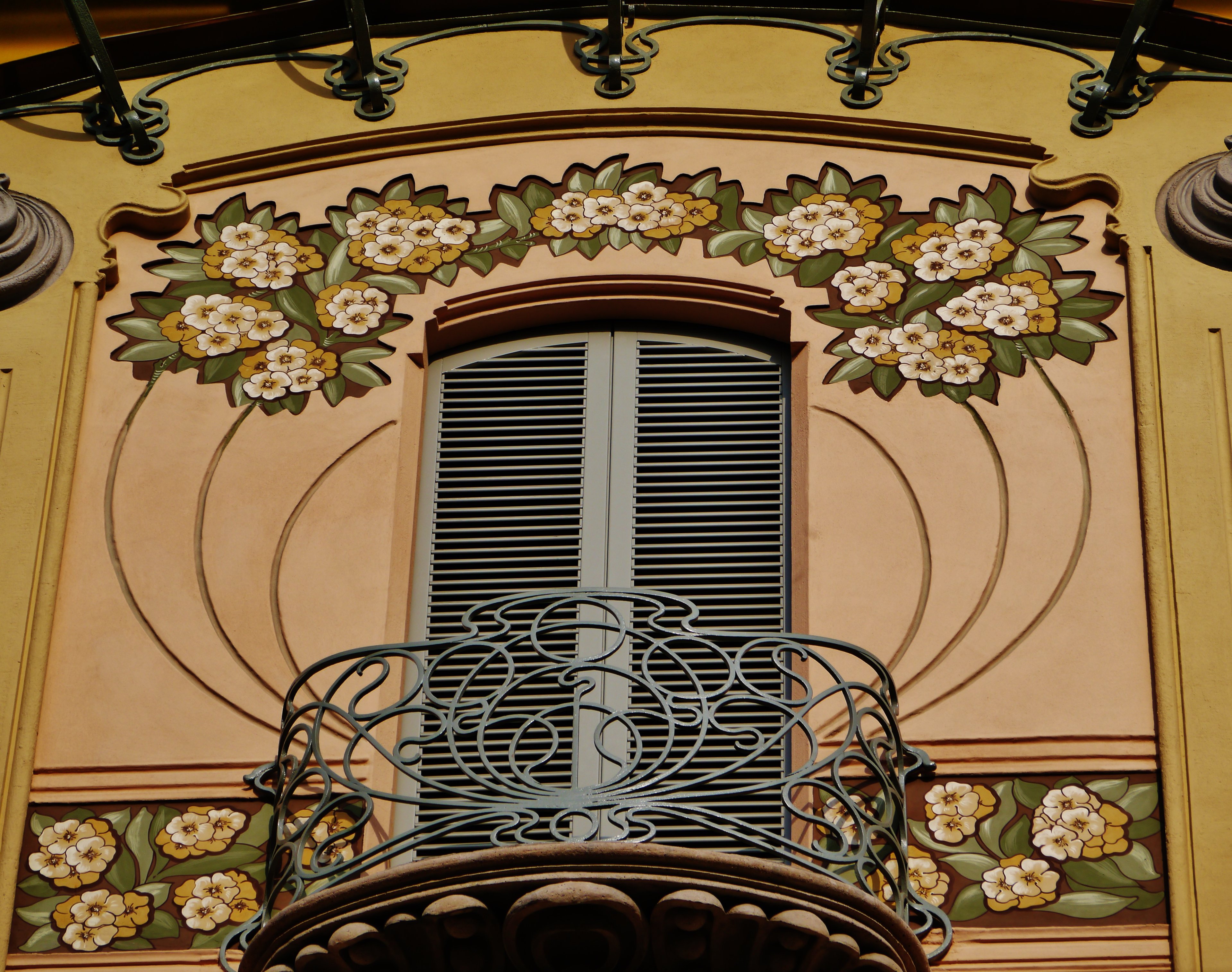 Caratteristiche fondamentali dello stile Liberty che ritroviamo in questo edificio sono l’utilizzo di elementi prefabbricati come il litocemento che sostituisce la pietra scolpita, le tonalità pastello della facciata e le decorazioni dipinte in stile floreale.