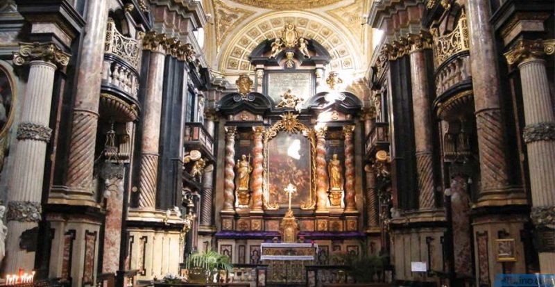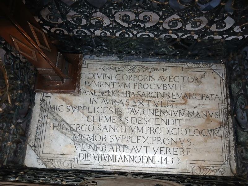 Sul pavimento della chiesa una lapide, circondata da un recinto di ferro battuto, segna il punto in cui l’asino si impuntò facendo cadere l’ostensorio.
