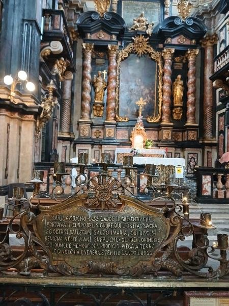Nel 1453 la città di Torino aveva ancora una struttura medievale con strade strette ad andamento tortuoso. Dove oggi c’è via Palazzo di Città allora c’era la piazza del mercato delle Erbe, presso l’antico Municipio, e subito accanto la piazza con la chiesa di S. Silvestro dove si svolgeva il mercato del Grano. In questa zona giunse un soldato, sfuggito alla battaglia fra le truppe francesi di Renato d’Angiò e Ludovico di Savoia, o forse solo un ladro che, negli stessi giorni di disordini, aveva partecipato al saccheggio della chiesa di Exilles, con un bottino fra cui il calice con l’ostia consacrata.