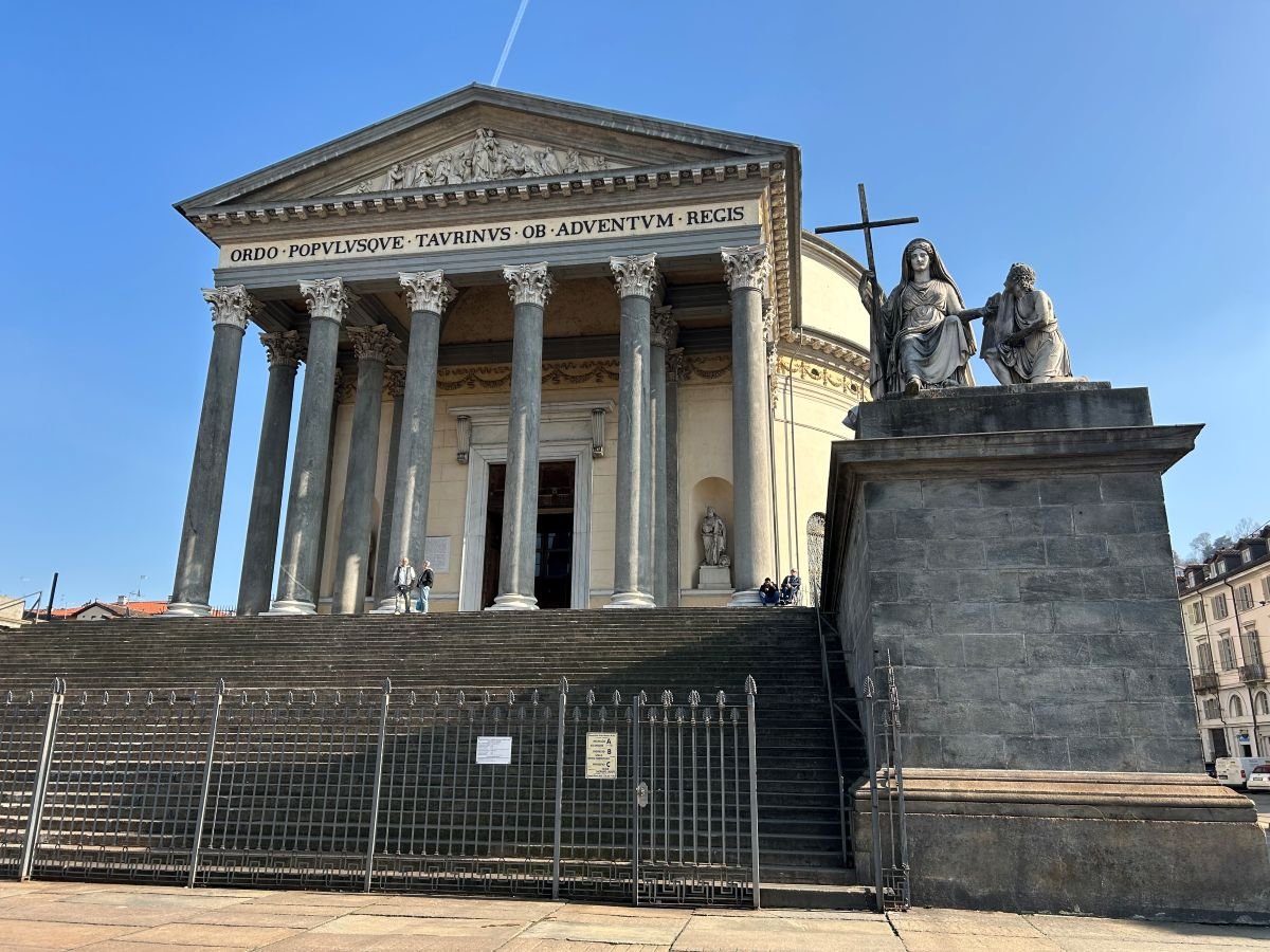 Un’epigrafe cita: «ORDO POPVLVSQVE TAVRINVS OB ADVENTVM REGIS» ovvero «La nobiltà e il popolo di Torino per il ritorno del re». Tale dedica, così come la costruzione dell’intero tempio, raccolse severe critiche fra i contemporanei per via del fatto che si fa menzione della venuta del Re e non del suo ritorno dopo l’esilio.