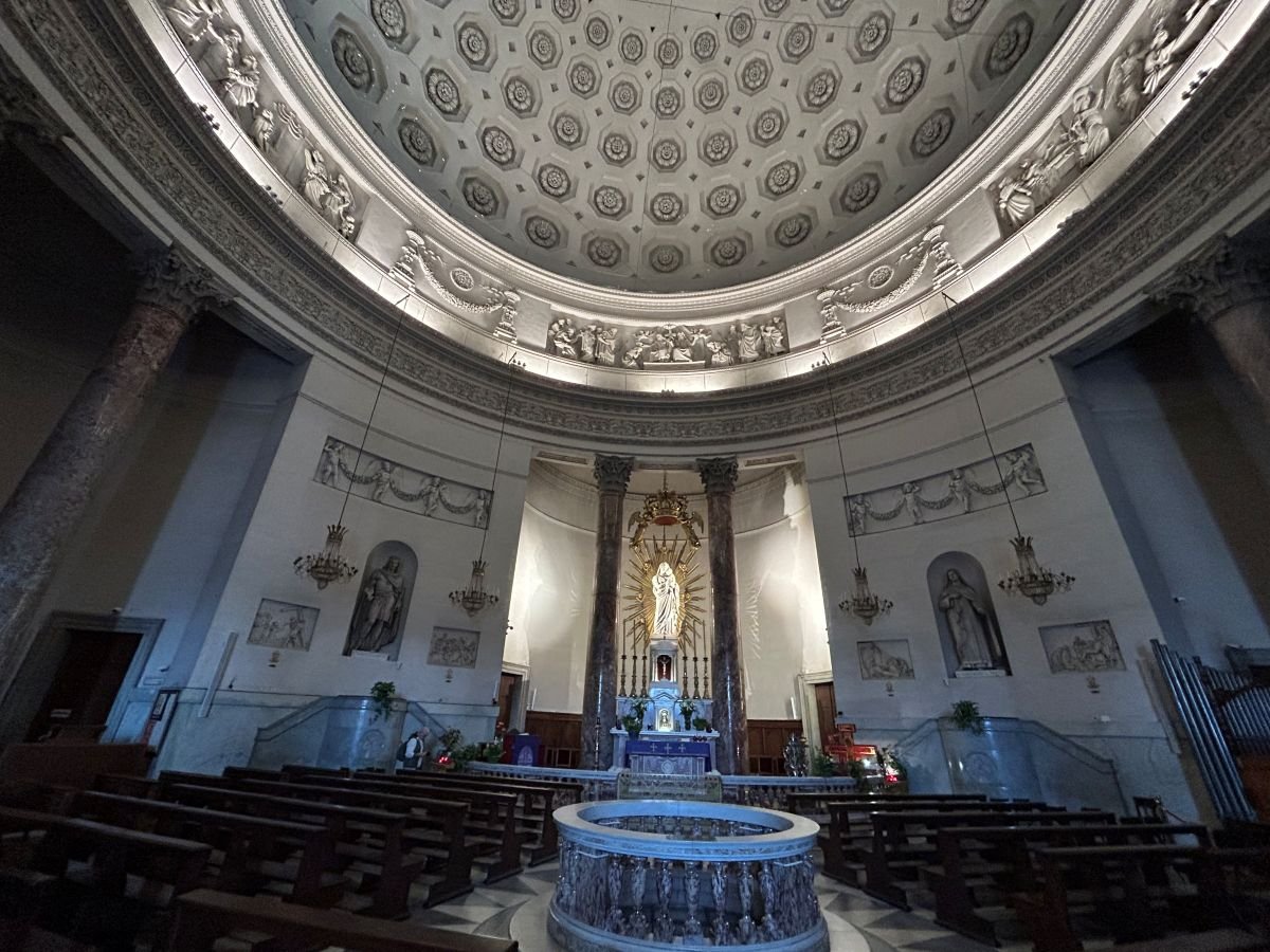 L’accesso alla chiesa avviene tramite un’ampia scalinata al termine della quale si trova il grande pronao con colonne dai capitelli corinzi. Il timpano è scolpito ad altorilievo e rappresenta la Vergine con il Bambino che riceve omaggio da parte dei committenti dell’edificio religioso.