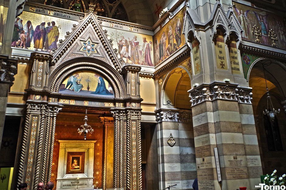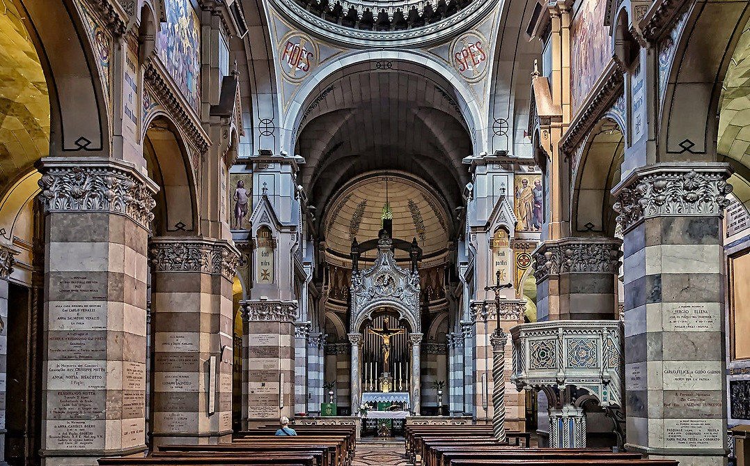 Al pittore Enrico Reffo ed alla sua scuola fu affidata l’intera decorazione della navata centrale, dipinta a encausto (antica tecnica pittorica che si basa sull’uso di colori mescolati alla cera attraverso il calore) su fondo oro e raffigurante una teoria di Santi, penitenti, vergini e martiri (1895-1916).