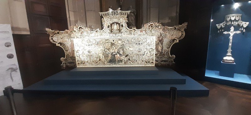 Completato nel 1749, il paliotto è composto da cinque elementi assemblati (una contro mensa, due ali laterali, un contro tabernacolo ed un Crocifisso all’interno di un baldacchino, da una pala rettangolare e da una struttura retrostante riportante sinuosità tipicamente barocche e si presenta come un trionfo di intarsi di materiali preziosi quali madreperla, avorio, tartaruga, ebano, palissandro, diaspro, lapislazzuli e pietre dure. Per questi caratteri, lo straordinario manufatto può essere considerato il più complesso e ricco manufatto di ebanisteria piemontese del Settecento, o quanto meno, l’opera più imponente del noto ebanista torinese.