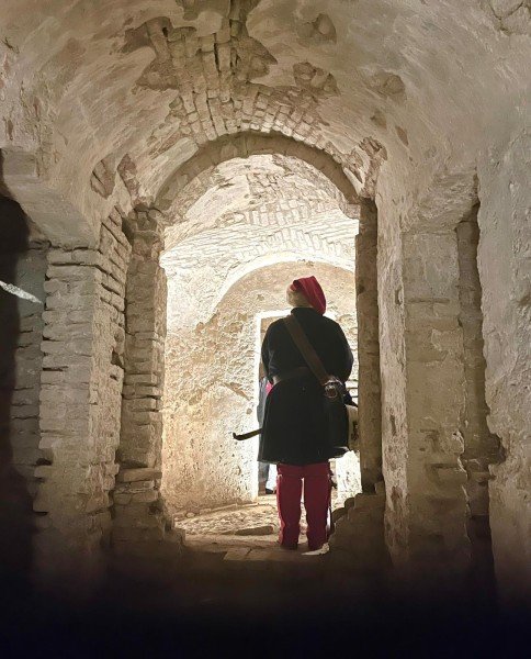 Particolare della galleria del Rivellino degli Invalidi con un componente del “Gruppo Storico Pietro Micca della Città di Torino” dell'Associazione “Amici del Museo” in uniforme da Granatiere del “Reggimento Guardie di S.A.R.” (Fotografia Francesca Campagnolo)