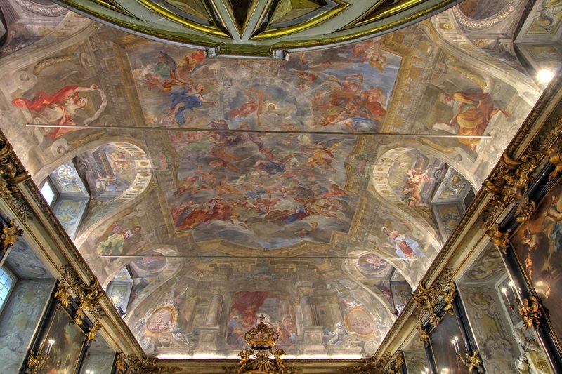 Il soffitto della Cappella è stupendamente affrescato e si presenta come una grande finestra verso il cielo e tratteggia il tema del trionfo del Paradiso. Si può notare la figura di Dio Padre, del Figlio Redentore ed una sintesi dei personaggi dell’antico e nuovo Testamento. L’autore principale di questo affresco è Stefano Maria Legnani, detto il “Legnanino”, mentre le colonne e vari fregi sono opera dei fratelli Grandi.