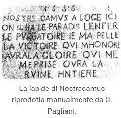 La prima notizia di un soggiorno torinese di Nostradamus risale al 1786, pubblicata nel Noveau Dictionnaire Historique. Una testimonianza del 1807 di un certo H. Carena riporta le misure (51 x 38 cm) della lapide. L’attestazione più completa fu un articolo di Corrado Pagliani del 1934 sulla rivista Torino (“Di Nostradamus e di una sua poco nota iscrizione liminare torinese”, in: Torino, vol.14, 1, 1934). Egli pubblicò una riproduzione di un dagherrotipo ottocentesco – presunta fotografia dell’originale, quindi a sua volta fotografata con tecniche attuali a partire solo dal 1922 – della lapide in marmo bruno di Baviera che riportava questo testo in franco-provenzale cinquecentesco: