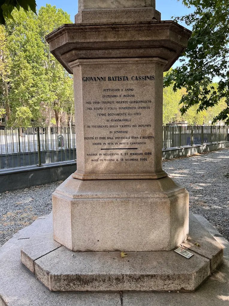 Giovanni Battista Cassinis (1806–1866), giurista e statista, fu ministro dell’Interno, guardasigilli, presidente della Camera dei deputati, senatore. La scritta alla base della statua recita: “Rettissimo d’animo, coltissimo d’ingegno, nel foro torinese valente giureconsulto, nel Regno d’Italia benemerito statista che tenne degnamente gli uffici di Guardasigilli, di Presidente della Camera dei Deputati, di Senatore. Meritò ed ebbe universale stima e rispetto”.