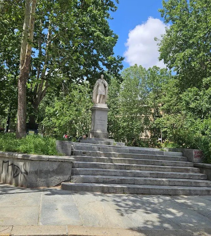 La statua fu eseguita in marmo dallo scultore da Gabriele Ambrosio (1844-1918) e inaugurata, nel 1871 nell’allora giardino della Cittadella. Lo raffigura in piedi, con una lunga redingote e un pesante mantello che, con un gesto teatrale della sua mano destra, raccoglie e scosta lasciando intravedere una pila di libri accatastati ai suoi piedi; la mano sinistra è levata al petto in tono enfatico.