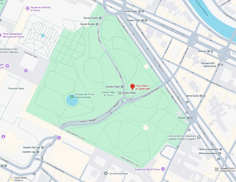Negli anni Venti del Novecento, per collegare il centro con il quartiere Vanchiglia, si rese necessario creare due strade nei Giardini Reali, oggi denominate Viale Primo Maggio e Viale dei Partigiani; alla loro confluenza nel 1933, fu posizionato il Monumento Nazionale al Carabiniere per onorare i caduti dell’Arma, istituita a Torino nel 1814 per iniziativa di Vittorio Emanuele II.