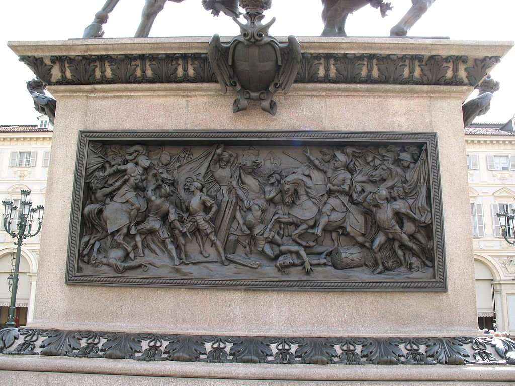 Sulla base di granito di Baveno, a ovest vi è il bassorilievo che rappresenta la battaglia di San Quintino nella quale l’esercito francese fu sconfitto da quello spagnolo insieme a truppe savoiarde comandate dal duca.