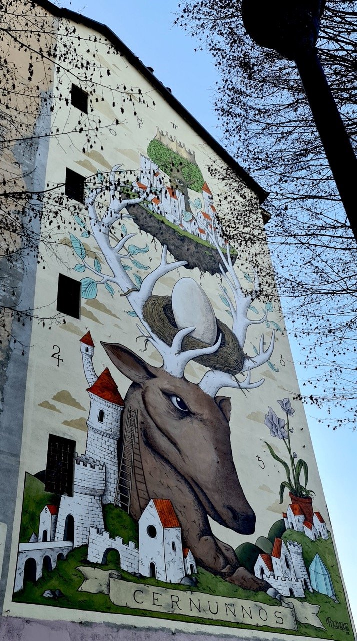 Murale di UFOCINQUE “CERNUNNOS” è un’opera di street art che richiama simboli mitologici legati alla natura ed al rinnovamento. L’opera fa parte del progetto “Toward 2030. What Are You Doing?”, che interpreta i 17 Obiettivi di Sviluppo Sostenibile delle Nazioni Unite. In particolare, il murale rappresenta il Goal 11: Città e Comunità Sostenibili, promuovendo la creazione di ambienti urbani inclusivi, sicuri e in armonia con i cicli naturali.