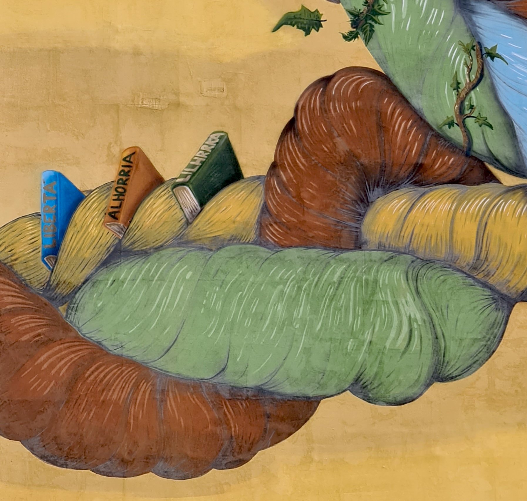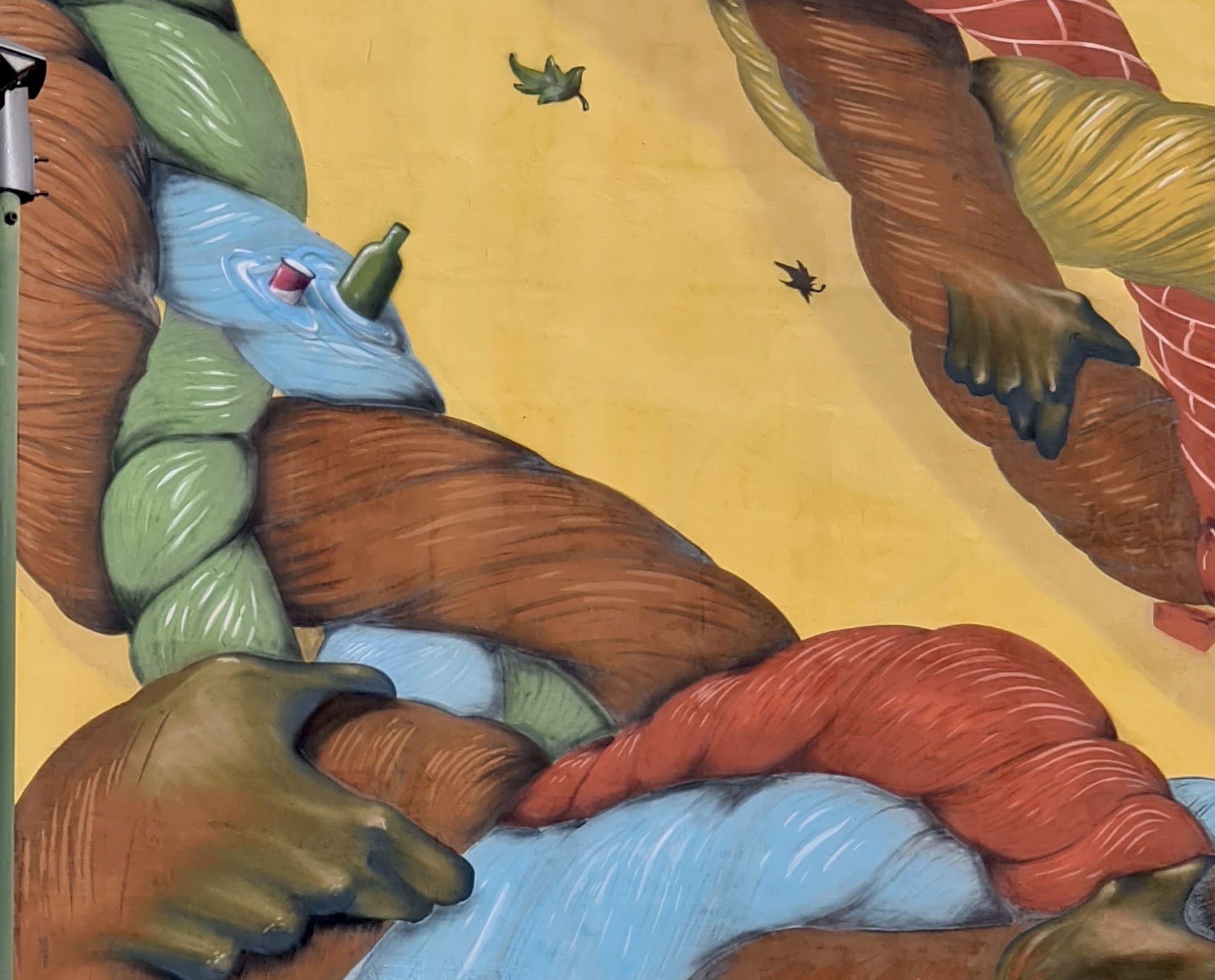 Monkeys Evolution “Intrecci”, 2018. L’idea riflette il concetto d’unione e di complessità. Il murale, con matasse di filo colorato, rappresenta i Goals e lo sviluppo sostenibile, simbolizzando le azioni virtuose degli individui. Le corde riflettono il tessuto sociale multietnico del quartiere, le storie e le diverse culture delle persone che lo abitano.
