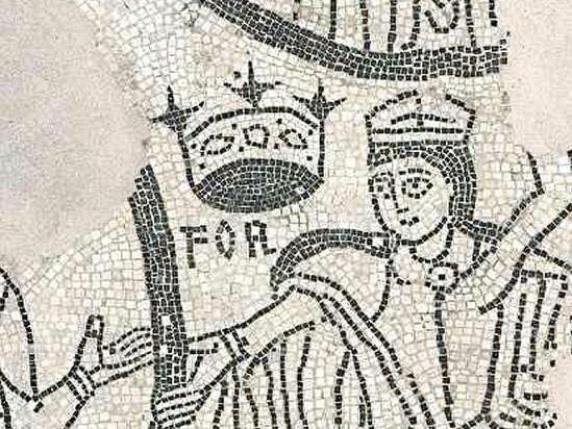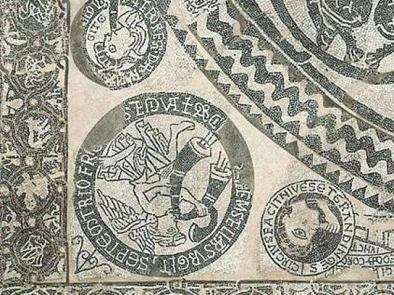 Scoperto nel 1909, raffigura al centro la personificazione della Fortuna che fa girare una ruota (i destini dell’umanità). La scena è circondata da cerchi decorati con figure di animali che rappresentano regioni della Terra, a loro volta racchiusi in una fascia circolare ondulata che è l’Oceano, con le isole Britannia, Scozia, Orcadi e infine Tule (il luogo remoto per antonomasia). Ai quattro angoli del quadrato, i venti. La raffigurazione della “Mappa del Mondo” e della “Ruota della Fortuna” sono i due temi che, espressi figurativamente e opportunamente combinati dal mosaicista torinese, dovevano indurre alla riflessione sulla precarietà delle cose mondane.