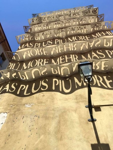 Le onde di alluminio sono tutte diverse, ognuna è bucherellata e larga circa 5 metri e mezzo. Le particolari strutture ad onda formano con la luce giusta delle ombre lungo tutto il muro del palazzo che rivelano la parola “più” in cinque lingue (inglese, italiano, spagnolo, francese e tedesco).