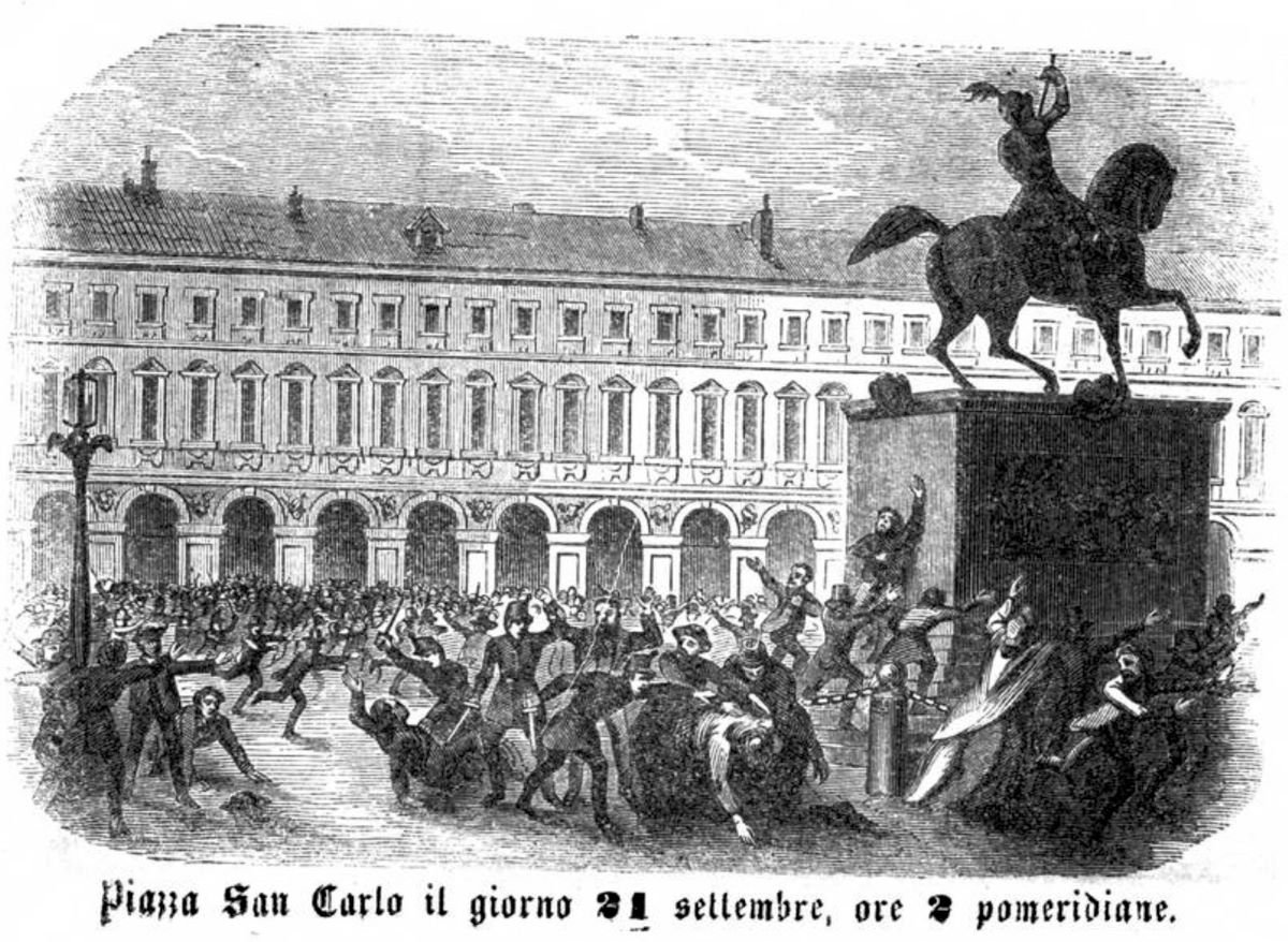 Nel settembre del 1864, dopo che il governo Minghetti prese la decisione di spostare la capitale da Torino a Firenze, in Piazza San Carlo la popolazione si riunì per protestare. I disordini causarono la morte di 62 persone e 138 feriti. Ancora oggi, alla base del monumento si vedono i fori delle pallottole sparate contro i manifestanti.