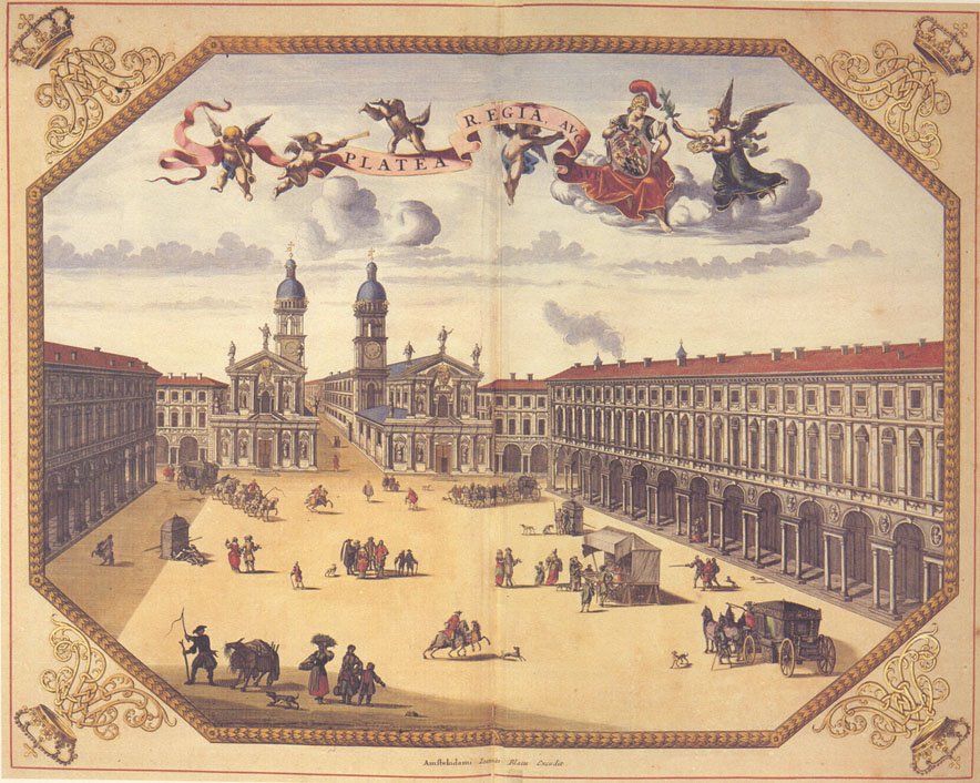 L’incisione del “Theatrum Sabaudiae” mostra l’ipotesi progettuale della piazza reale, anche se non ancora ultimata.