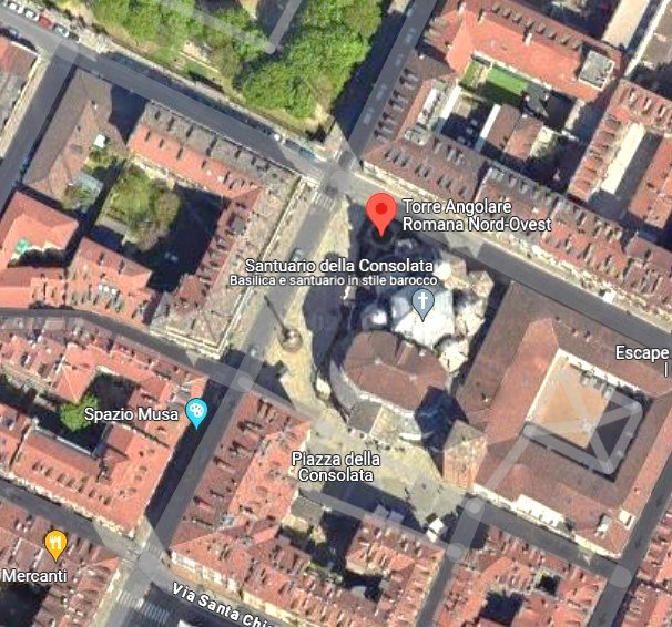 Vi si dipartivano due tratti di mura, uno in direzione est verso la Porta Palatina e uno in direzione sud, lungo via della Consolata verso la scomparsa porta praetoria (la medievale Porta Segusina).