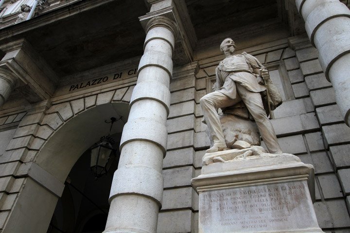 A destra la statua di Ferdinando di Savoia duca di Genova (1822 – 1855).