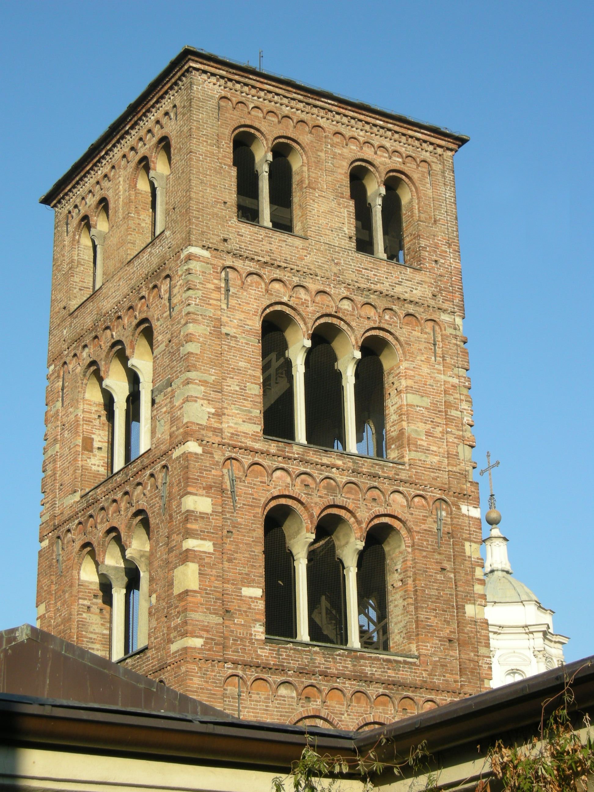 Campanile del secolo XI, con bifore e trifore.