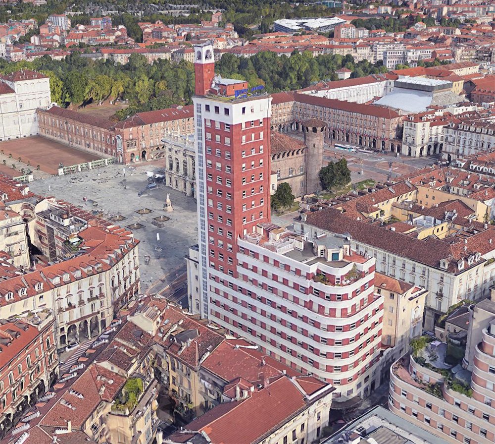 Le facciate così diverse trovano collegamento sulla piazzetta, che funge da imbocco delle tre vie per poi innalzarsi, con una torre di circa 90 metri d’altezza. La torre e il corpo di fabbrica saranno la prima struttura di edilizia civile realizzata in acciaio in Italia. Un edificio che caratterizzerà lo skyline del centro di Torino creando grandi polemiche negli anni a seguire.