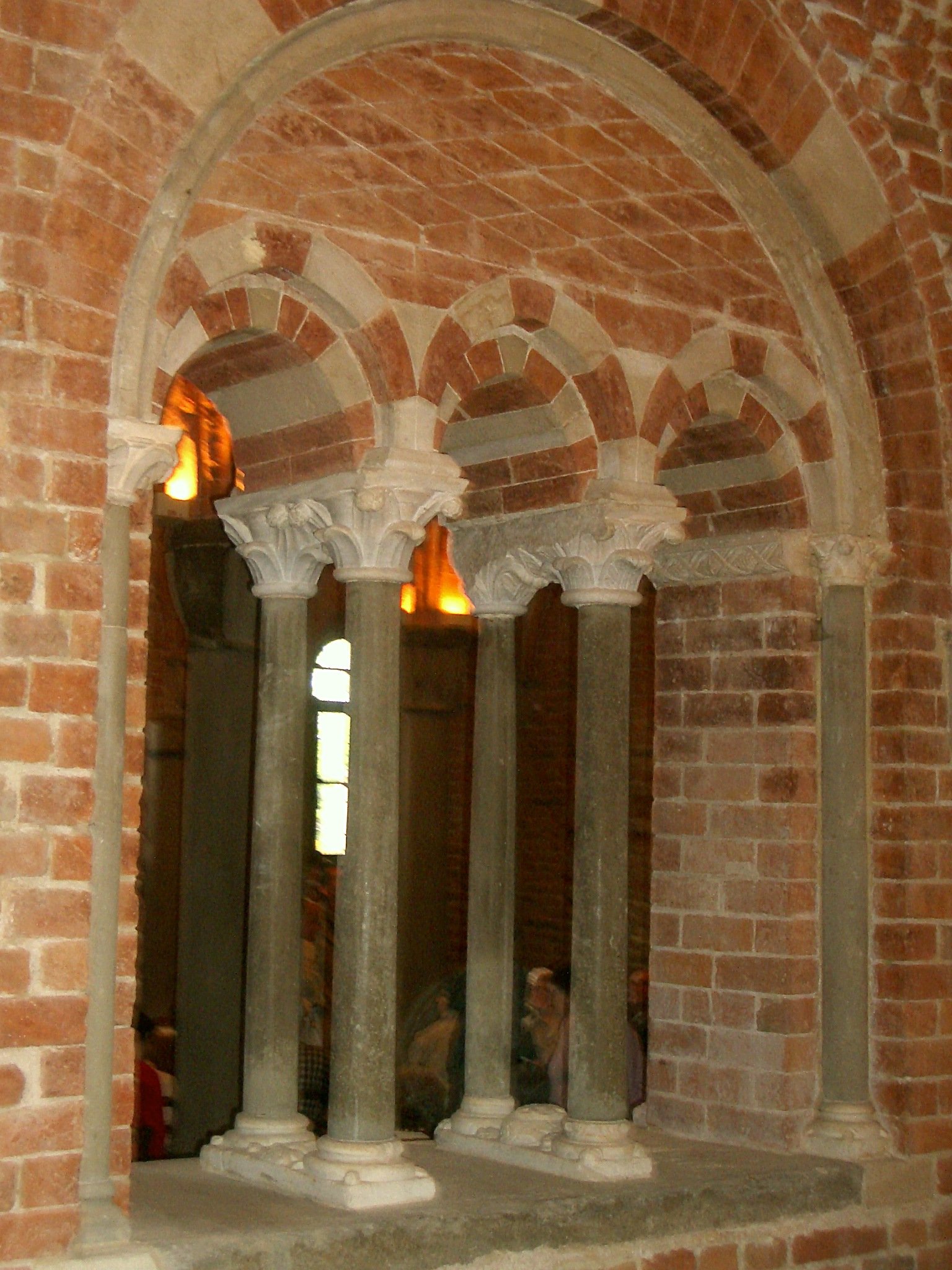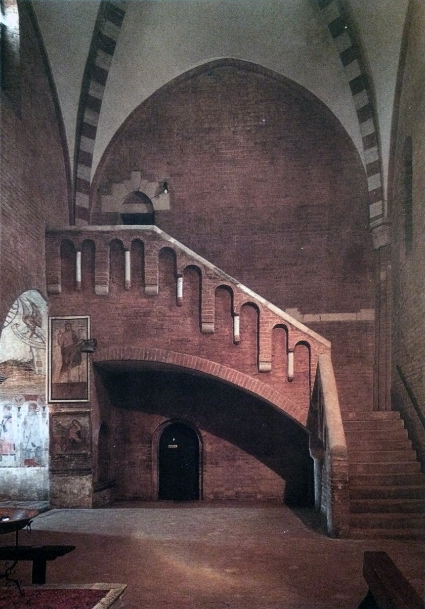 L’esterno della chiesa ha caratteristiche romaniche nella muratura in laterizi, coronata da un fregio ad archetti pensili in cotto, oggi ancora visibile nella zona del transetto, delle cappelle e nel nucleo orientale.