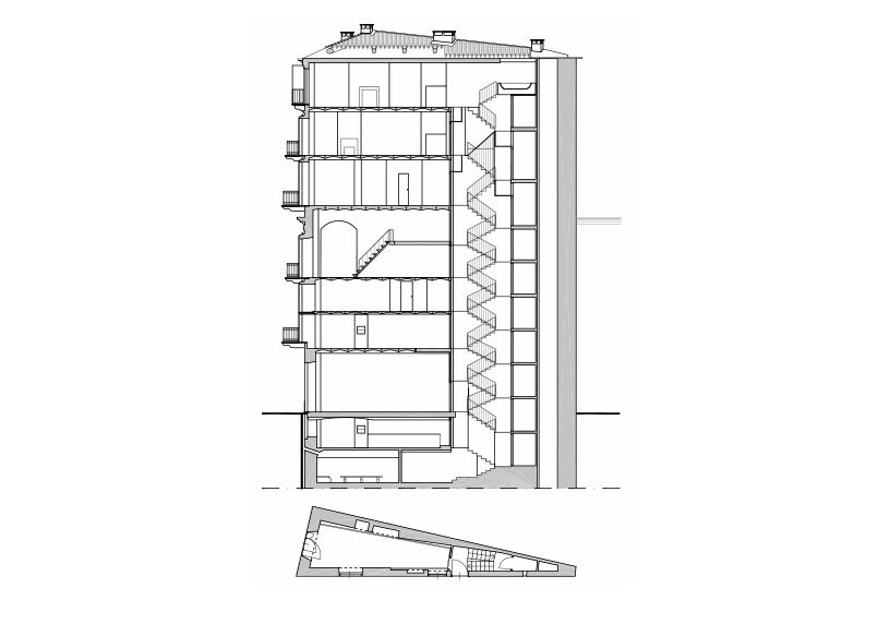 La casa è caratterizzata da ambienti adattati, anche con l’inserimento nella parte più stretta di stanze triangolari, per i quali furono realizzati speciali arredi.