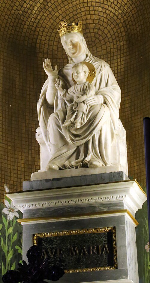 Collocata in un altare barocco realizzato nel 1646 da Francesco Rusca, la statua in marmo che raffigura la Madonna con Bambino presenta una macchia sulla guancia destra e la tradizione popolare l’ha attribuita a uno schiaffo miracolosamente rimasto impresso. La critica a lungo l’ha attribuita a Benedetto Antelami (1150-1230), ma la notevole opera per i suoi influssi d’oltralpe e il linguaggio goticheggiante è oggi datata alla seconda metà del XIII secolo.