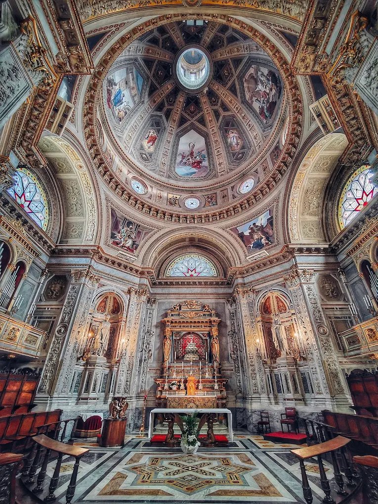 Esternamente l’edificio colpisce per l’imponenza della facciata settecentesca di Benedetto Alfieri, sormontata dalle gigantesche statue dei dodici Apostoli e del Redentore (XIX secolo).