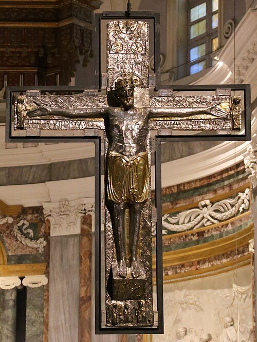 La chiesa presenta pianta a croce latina a tre navate divise in cinque campate, coperte da volte a cupola e sostenute da massicci pilastri sovrastati da colonne in finto marmo. Nella zona absidale si eleva la grande cupola del XIX secolo e il pregevole coro ligneo; notevole è il monumentale crocifisso ottoniano del X secolo, alto 3,27 e largo 2,36 m, realizzato in legno ricoperto da una lamina d’argento lavorata a sbalzo sul lato frontale.