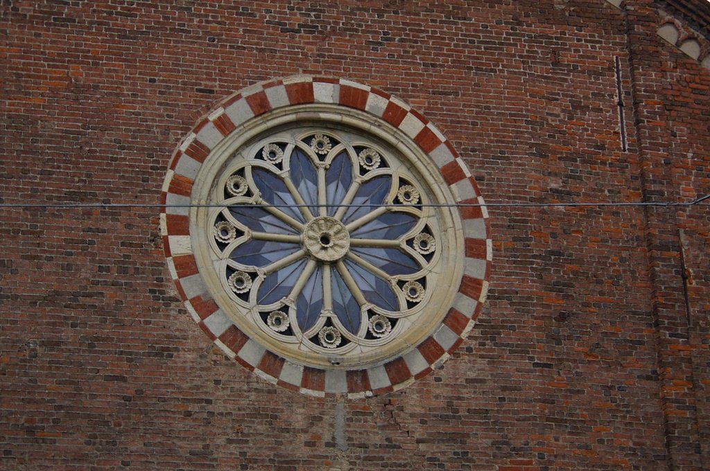 La facciata romanica in laterizio reca un portale moderno sormontato da un bel rosone.