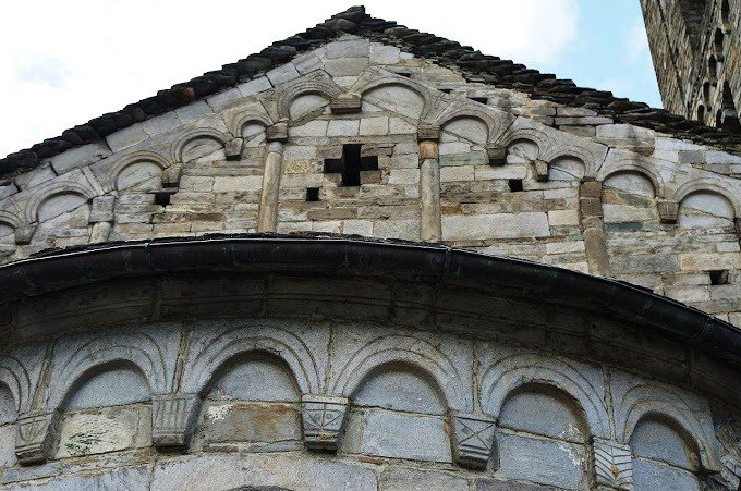 La chiesa, datata tra il X e XII secolo, è il risultato di una lunga serie di interventi. Poco al di sotto del tetto vi è una fila di archetti pensili divisi da lesene in gruppi di due o tre. Le ghiere e le mensoline sono decorate a graffito con un vasto repertorio di motivi del più antico romanico: fregi geometrici, testine piatte, croci di forme diverse, delicati motivi grafici.