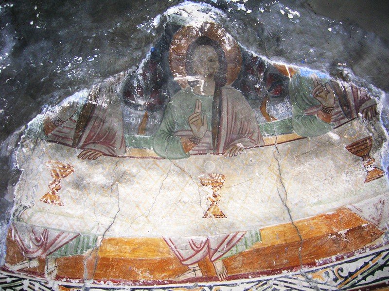 Le uniche parti decorate con affreschi sono le absidi; quella nord della chiesa superiore ha affreschi datati alla fine del XIII secolo, che si rifanno ai modelli propri della pittura romanica. Nel catino absidale vi è una delle più antiche raffigurazione della Trinità con le tre Persone identiche assise a mensa e recanti il calice eucaristico.