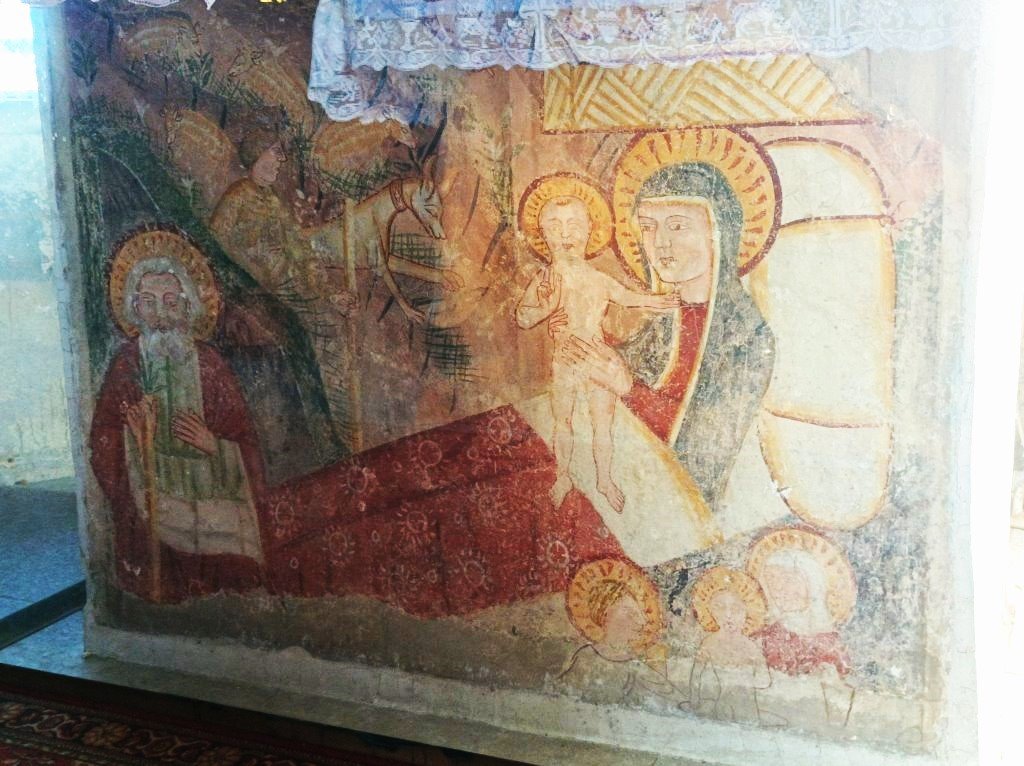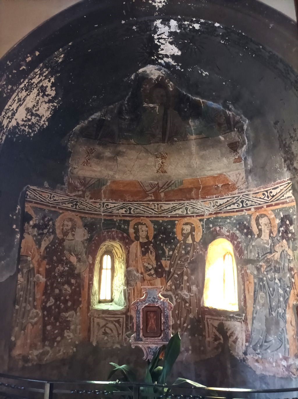 Più in basso, sulla parete cilindrica dell’abside, vi sono sei figure di Apostoli, a gruppi di due, separati dalle monofore. Un’altra serie di sei Apostoli doveva essere presente nell’abside meridionale, il cui altare è ornato da una Natività del cosiddetto “pittore della Madonna di Re”, attivo alla fine del XIV secolo. Nelle absidi inferiori rimangono solo frammenti di affreschi.