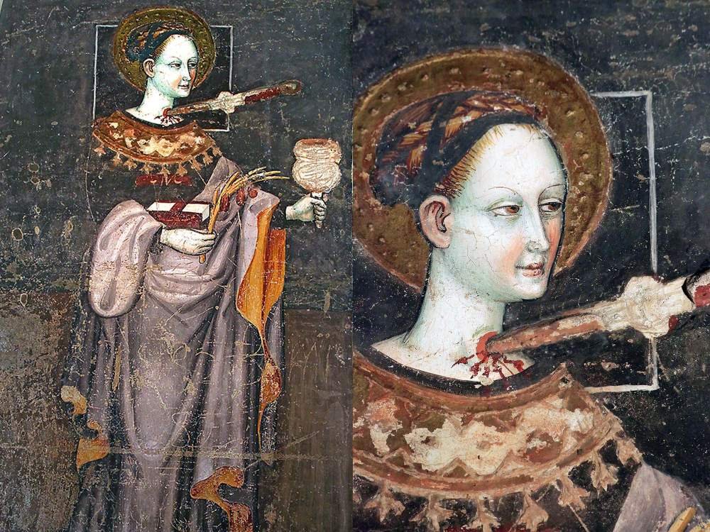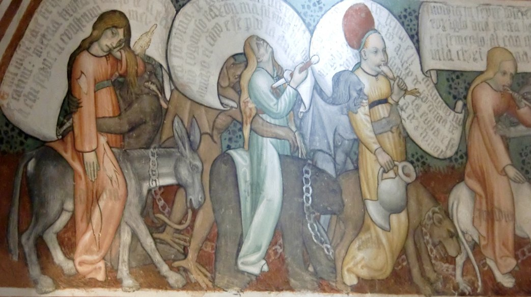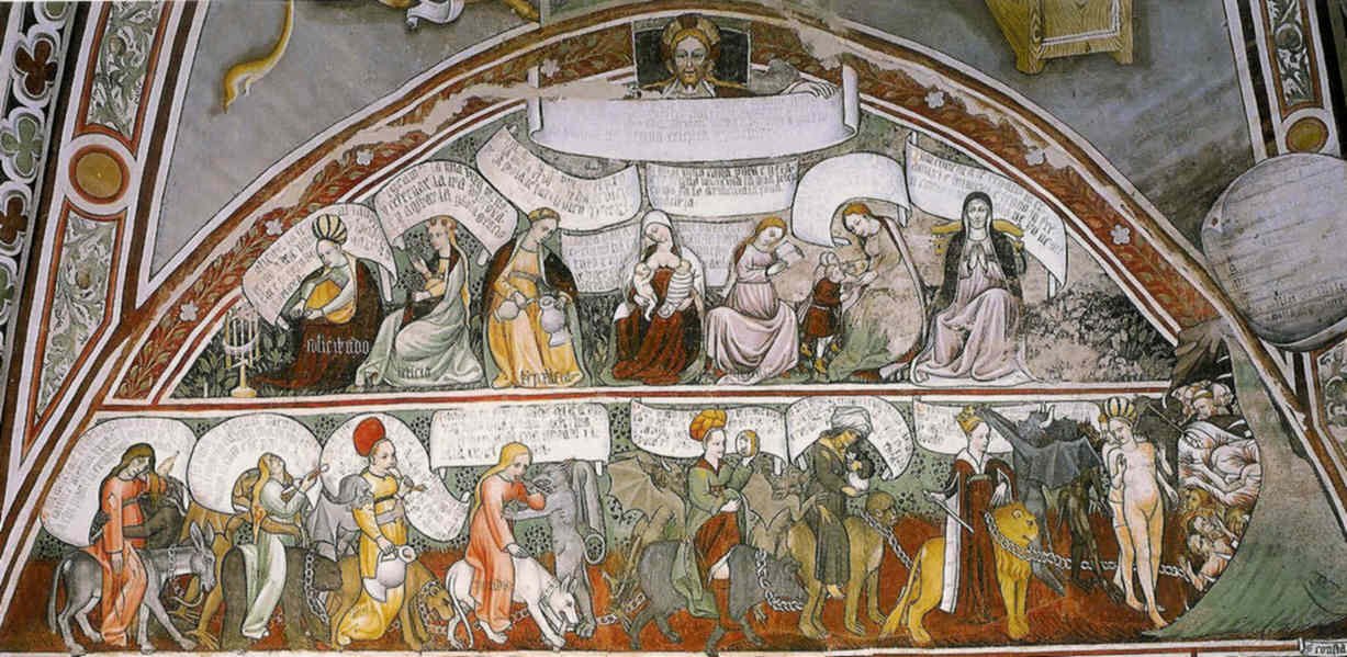 La parete sinistra, con la sua raffigurazione dei vizi, è particolarmente significativa per la potenza con cui i vizi sono incarnati da figure umane e animali, creando un allegorismo che conferisce alla pittura una qualità narrativa. L’affresco di Accidia ritrae una donna pigra, con sguardo vuoto, mentre Ira è dipinta come una figura tormentata che si trafigge con un pugnale, espressione di violenza interiore resa con grande precisione. La scena sembra riflettere un realismo quasi “scientifico”, come se l’artista avesse osservato con distacco le tragiche manifestazioni della follia umana.