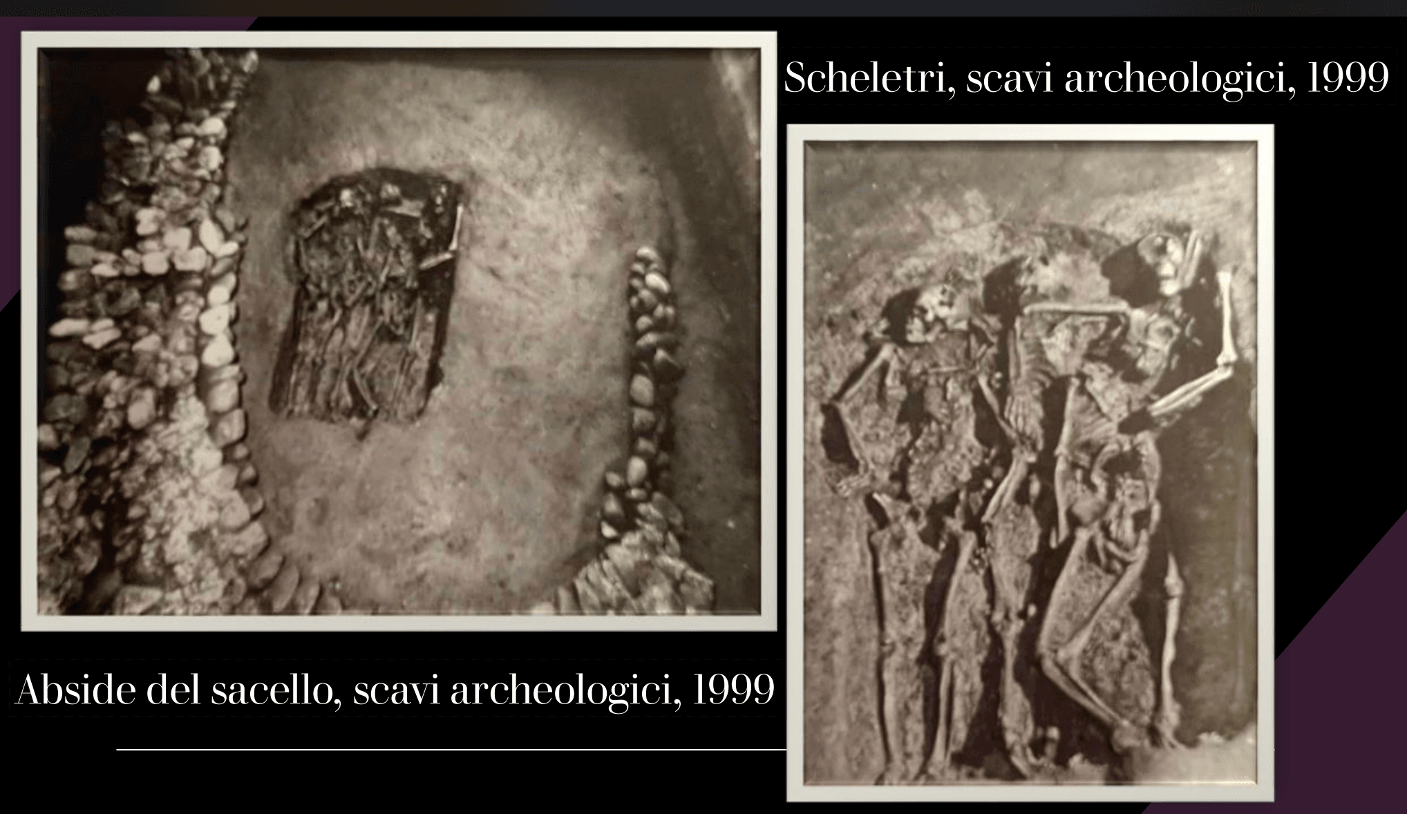 Gli scavi del 1999 hanno rivelato una struttura primitiva, e proprio davanti all’altare sono stati ritrovati gli scheletri di quattro uomini di alta statura, morti in circostanze violente. Presentano fratture al cranio e sono stati seppelliti in fretta, uno sopra l’altro, con uno dei corpi deposto a pancia in giù. Il dramma che li ha coinvolti rimane un mistero, testimoniato da misere ossa che raccontano un orrore sepolto nel tempo.