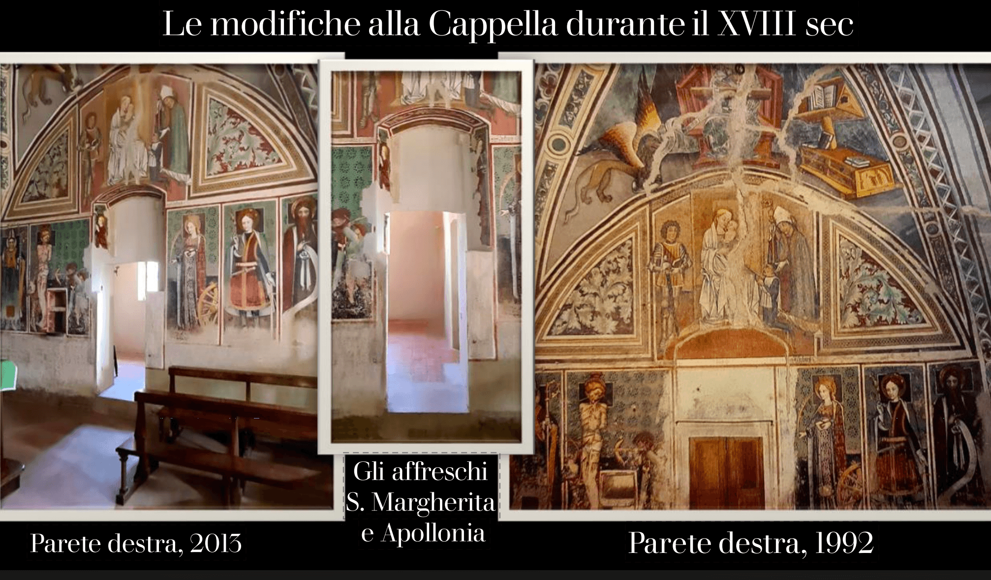 Il ciclo pittorico si suddivide in due settori principali: sulla parete sinistra sono rappresentati i sette vizi capitali, un tema ricorrente nell’iconografia medievale, mentre la parete di fondo presenta scene religiose, tra cui la Deposizione.