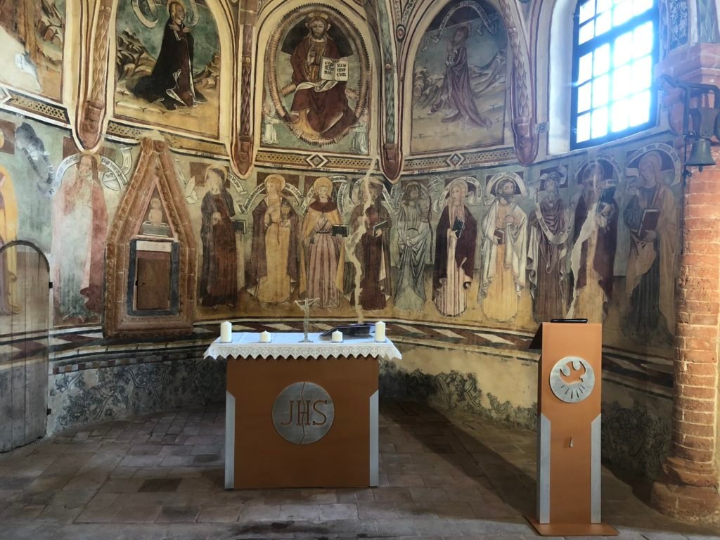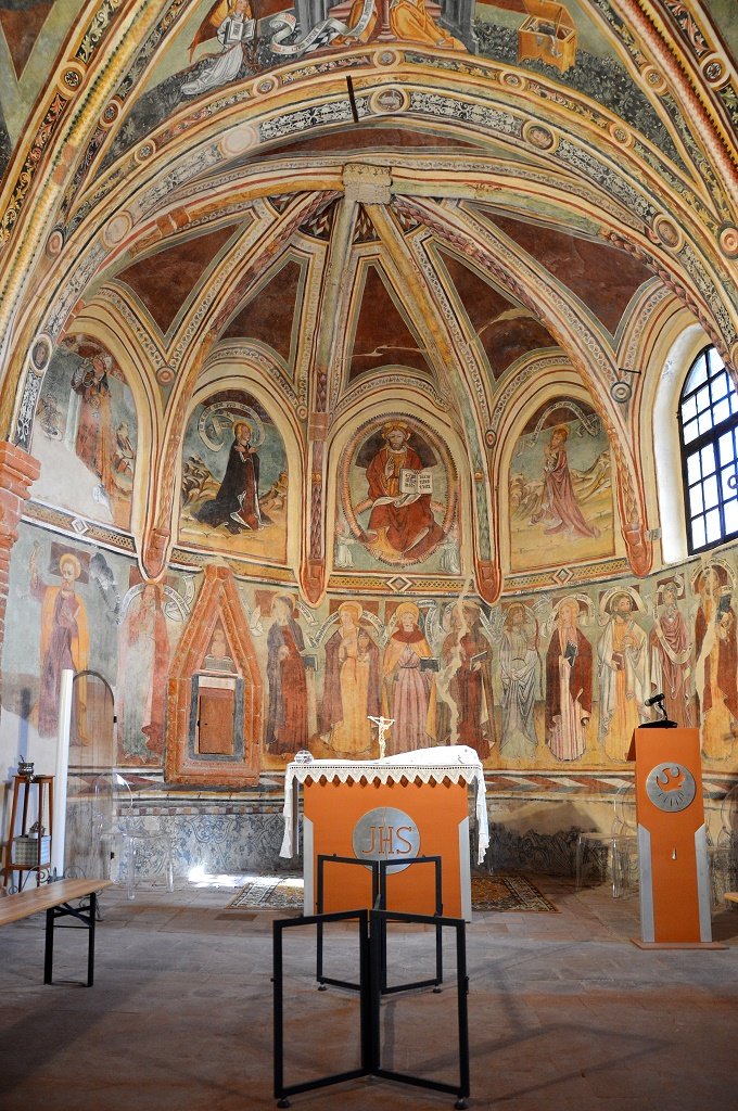 All’interno della cappella, oggi a navata unica, si possono osservare, sulle pareti del piccolo presbiterio poligonale, le figure dei dodici Apostoli sopra i quali campeggiano, nel catino absidale, al centro l’immagine del Cristo Pantocratore inserita in una mandorla con ai lati la Madonna in preghiera, san Grato e san Giovanni Battista.