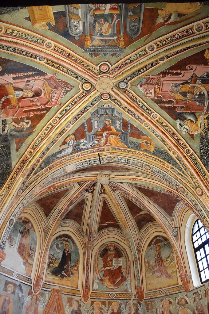Il soffitto a crociera, scandito da costoloni in muratura di mattoni intonacati e affrescati con motivi floreali e geometrici, è diviso in quattro vele che conservano gli affreschi raffiguranti i quattro Evangelisti.