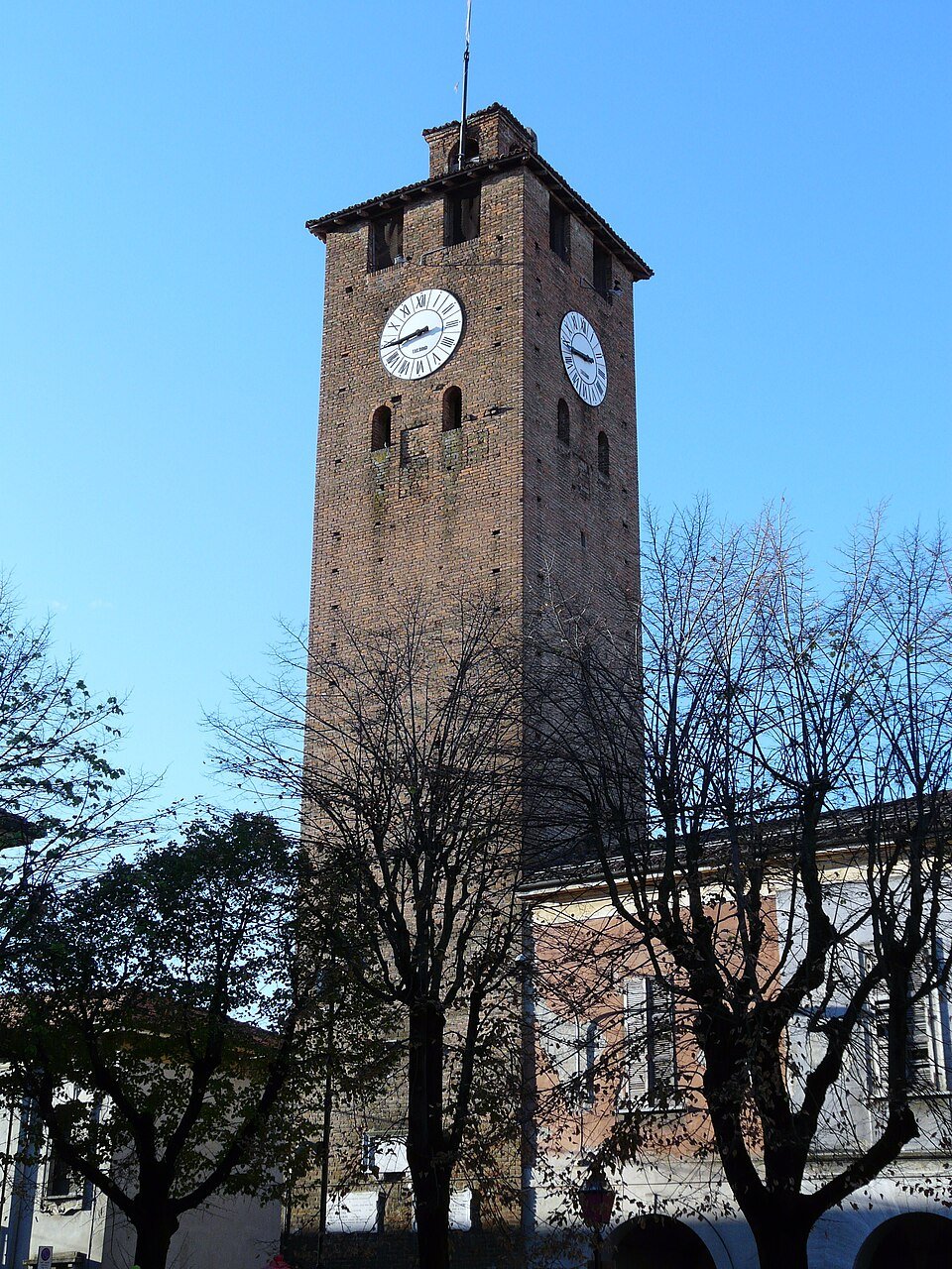 PONTECURONE (AL). Torre civica medievaleA pianta quadrata in mattoni a vista, risale al XIII-XIV secolo, ma l’origine non del tutto accertata: secondo alcuni è avanzo del duecentesco castello; per altri fu fatta costruire da Gian Galeazzo Visconti nel 1392 insieme ad altre fortificazioni per meglio difendere Voghera. Fu modificata in seguito nella copertura e con l’inserimento dell’orologio. ArchitettonicoMedioevoGoticoRomanicoCastelloA cura di AC