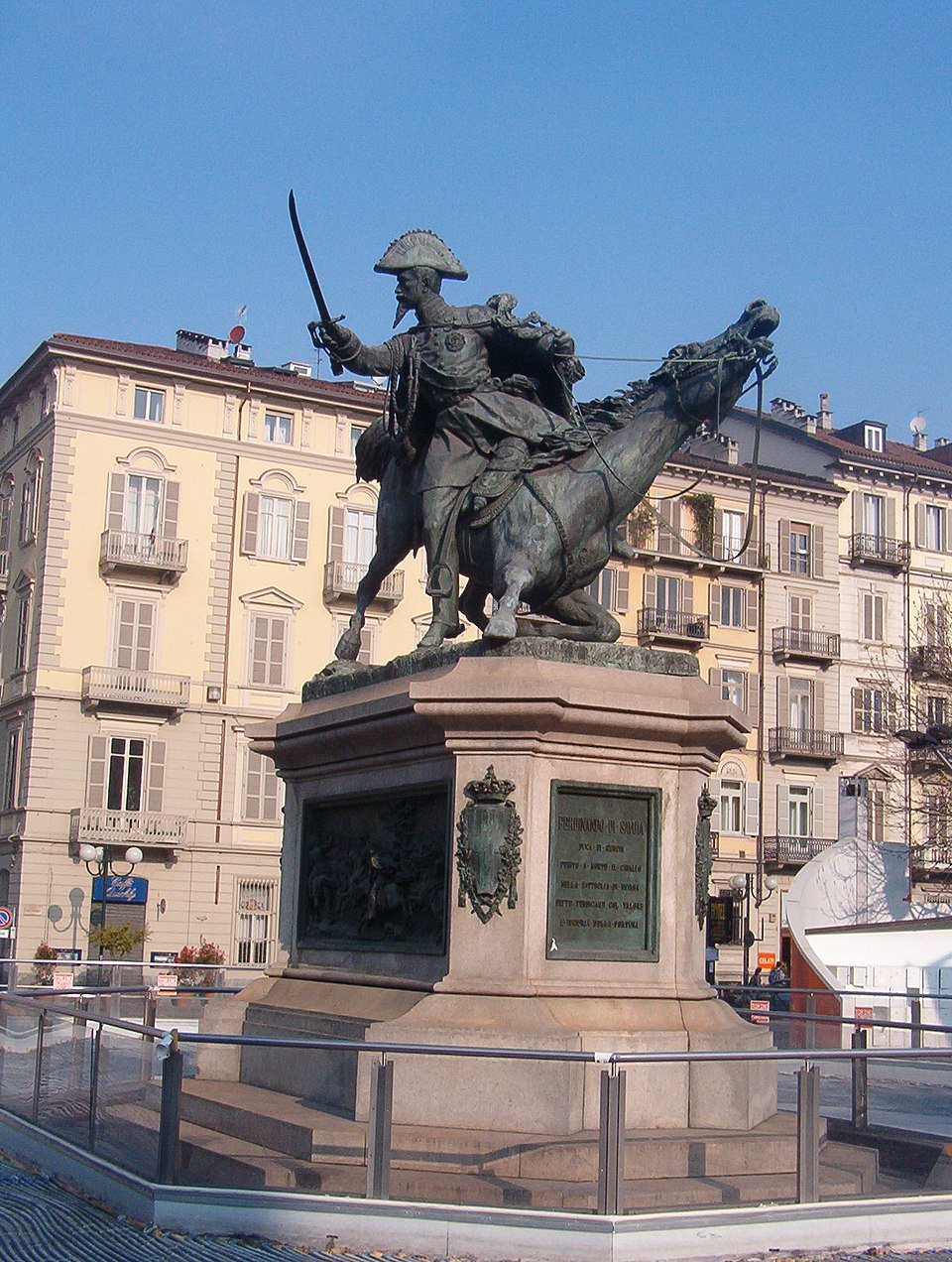 Amedeo di Savoia duca d’Aosta (1845 – 1890), ritratto in divisa sul cavallo impennato, fu realizzato in bronzo da Davide Calandra (1856-1915) e posto nel 1902 nel Parco del Valentino.